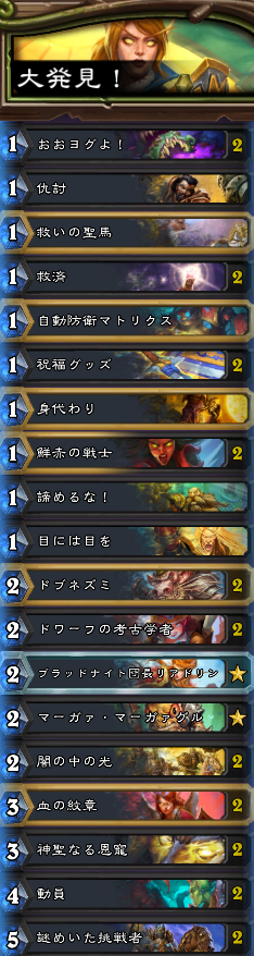 実際の所、例えば1/1/3の「アルダーの従者」を発見し、すぐ出すと、実質2マナで3/5のミニオンを出せるという事になる。弱くは無いが、ワイルドでわざわざ2枚使ってやるほどのコンボかというと…うん。発見の性質上毎回良いカードが貰えるわけでも無く、2/3/5バニラが貰えたらまだ良い方だという事も考えるとそこまで積極的に狙いたいコンボでも無かった。