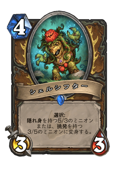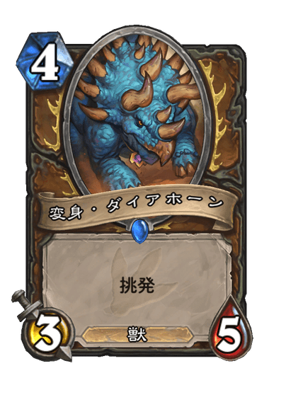 続いては大魔境ウンゴロで登場した「シェルシフター」が選択で変身する「変身・ラプター」です。スタンにいた頃もそんなに使われるカードでは無かったと思いますが、今さらワイルドで使う人はさらに全くいなさそうなので見かける事は中々無いでしょう。