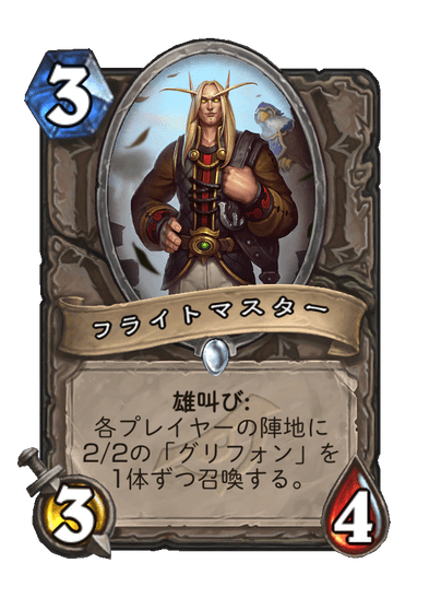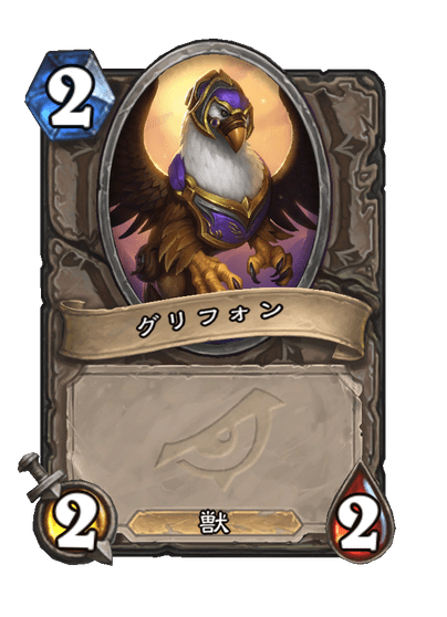 続いては悪党同盟のカード「フライトマスター」が召喚する「グリフォン」です。自分と相手の陣地に1体ずつ出てくるという、珍しいミニオンです。グリフォンを召喚するカードは他にもハンターの「露払い」がありますが、絵はちゃんと違います。