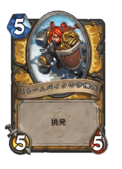 最後はこの「ストームパイクの守備兵」です。このカードの名前を憶えている人は少ないかもしれません。スタッツと挑発を見て召喚元のカードを当てられる人はいると思いますが、名前で分かったら相当凄いと思います。私も名前だけでは分かりません。