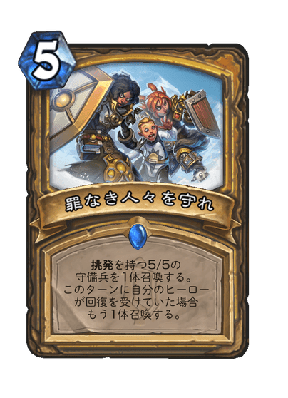 召喚元はこの「罪なき人々を守れ」でした。「守備兵を召喚する」と書かれているだけで、「ストームパイクの守備兵」とは書かれていませんね。このように、召喚元のカードテキストに名前が書かれていないと、余計に憶えづらい気がします。